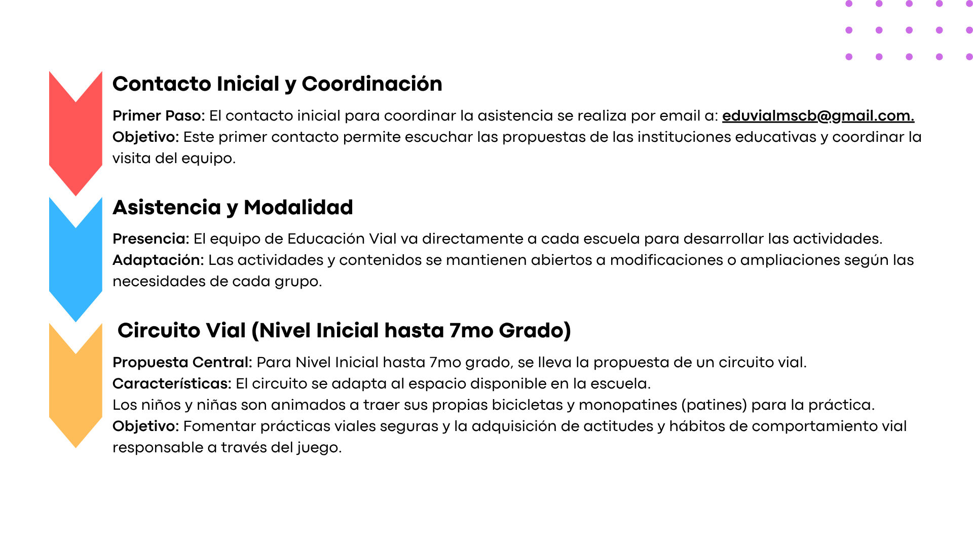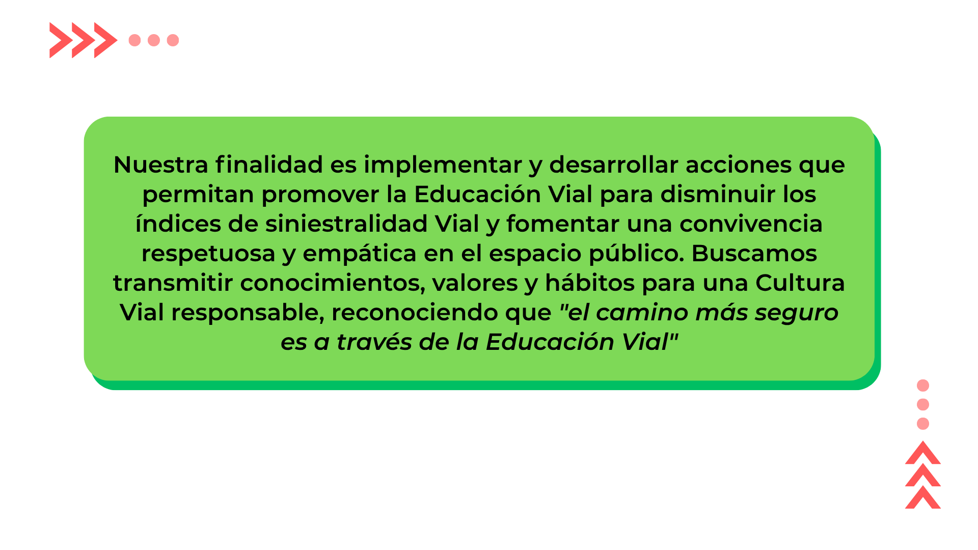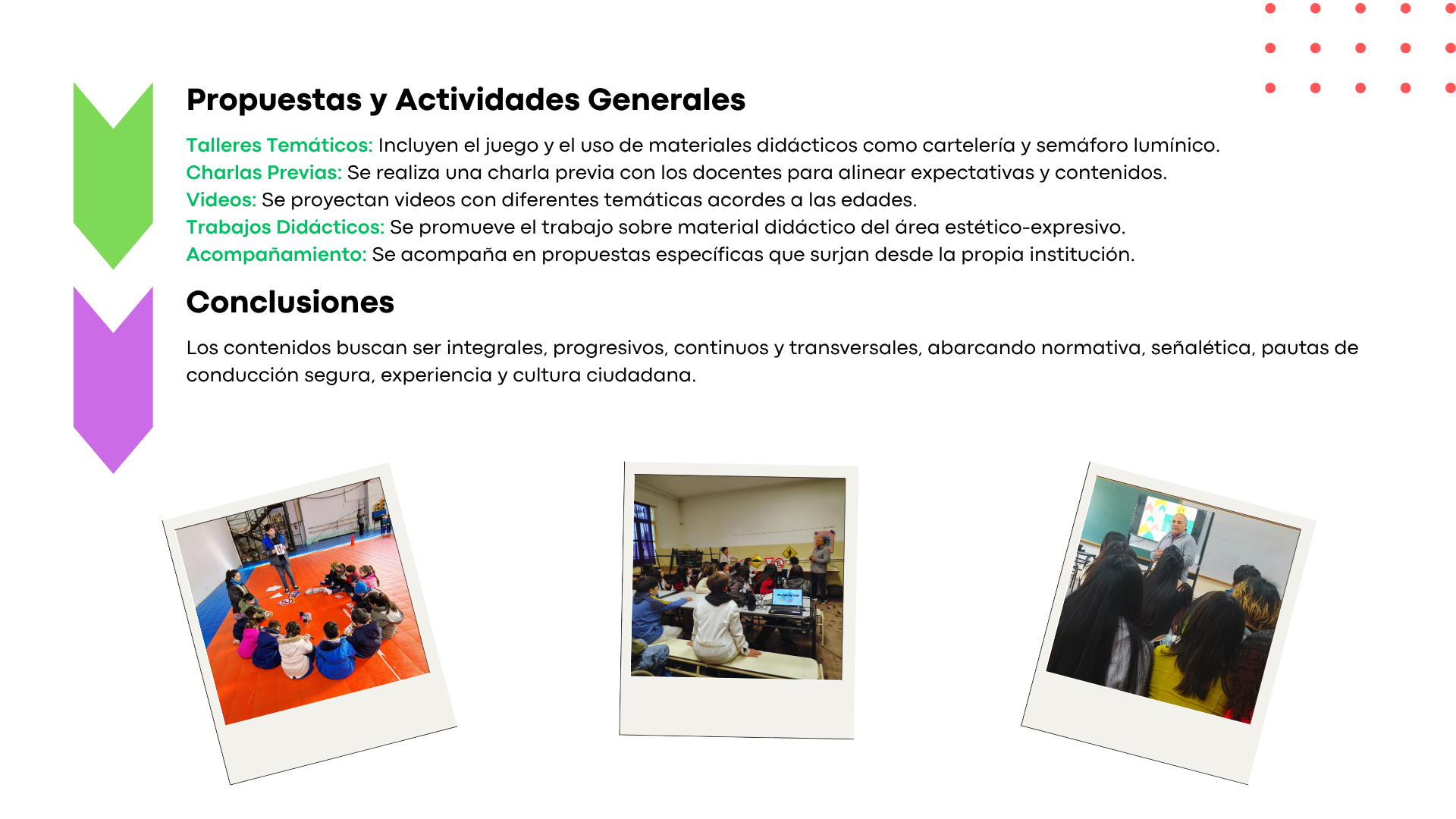 El Municipio cuenta con personal de Tránsito y Transporte para la realización de capacitaciones sobre prevención vial en escuelas de todos los niveles y especiales. También cursos de readecuación del correcto uso de la vía pública y concientización sobre los efectos del alcohol al volante, y aquellos solicitados por Oficios Judiciales para la reinserción a la sociedad. Forma parte, además, de las actividades de prevención convocadas por la Mesa 6 de Septiembre y organiza jornadas en la vía pública.